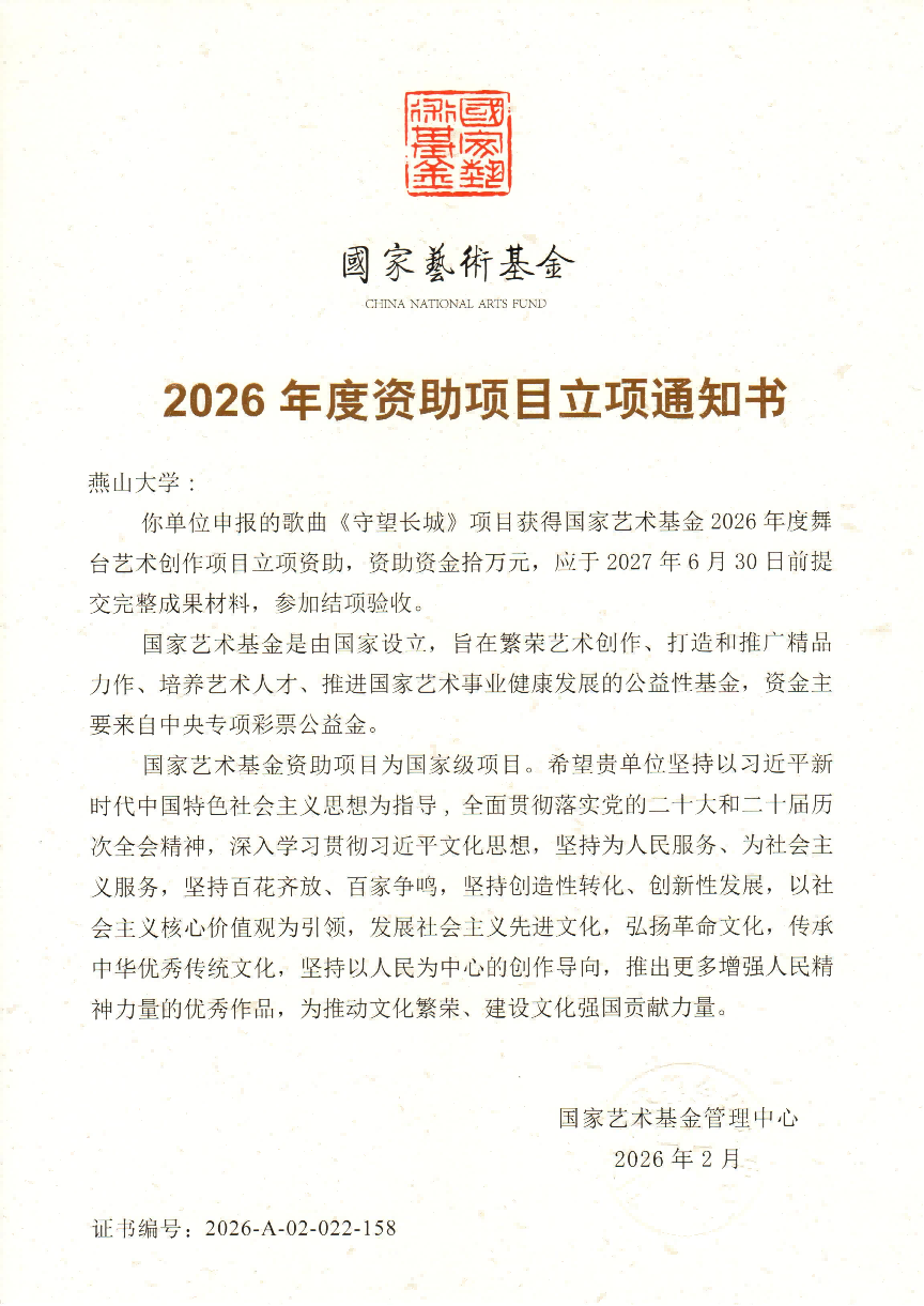 近日,国家艺术基金管理中心公布了国家艺术基金2026年度资助项目立项结果,我院宁岩鹏老师申报的歌曲《守望长城》获批国家艺术基金2026年度舞台艺术创作资助项目。这是我院在高层次艺术创作项目立项方面取得的又一重要成果,充分体现了足球竞猜