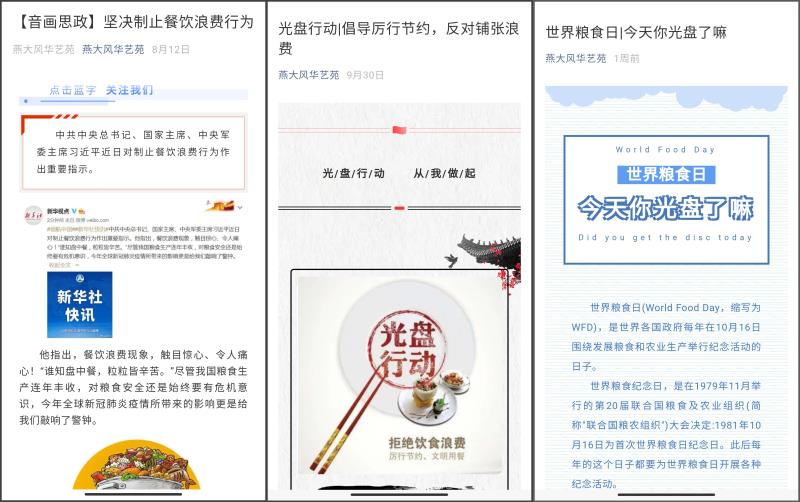 持续开展“天地粮心、惜墨如金”系列宣传活动,利用“燕大风华艺苑”网络平台,已发布3期“世界粮食日|今天你光盘了吗”、“光盘行动|倡导厉行节约,反对铺张浪费”、“【音画思政】坚决制止餐饮浪费行为”专题推文,在足球竞猜