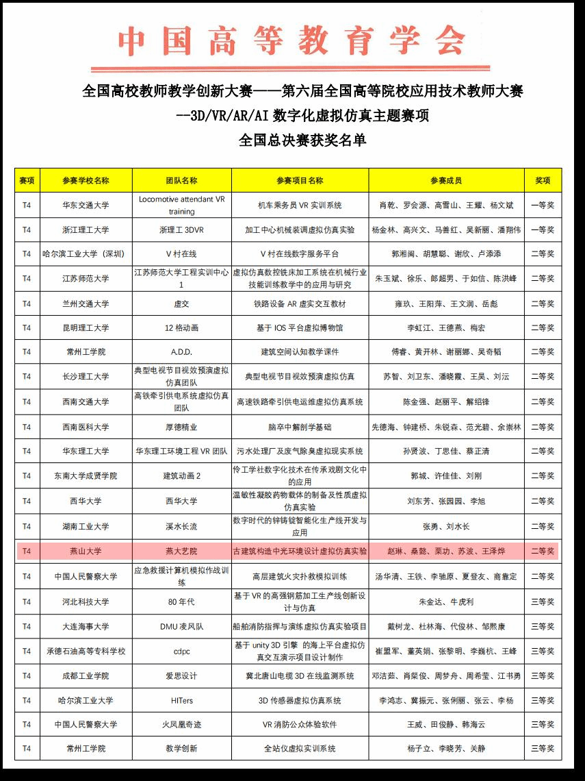 由中国高等教育学会主办的全国高校教师教学创新大赛—第六届全国高等院校工程应用技术教师大赛于本月三日刚刚落下帷幕,经过省赛选拔、国赛答辩等环节,我校足球竞猜 赵琳教授带队的《古建筑构造中光环境设计虚拟仿真实验》项目获得了数字化虚拟仿真赛项全国总决赛二等奖的好成绩。