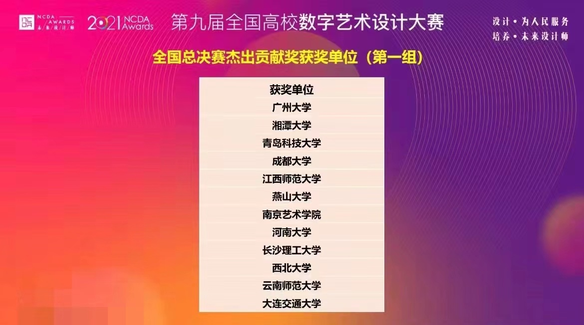 此外,该届赛事中我校还获得了全国总决赛杰出贡献奖获奖单位和优秀赛区奖,并荣膺全国高校数字艺术设计大赛全国首批12家数字艺术区块链双创基地。