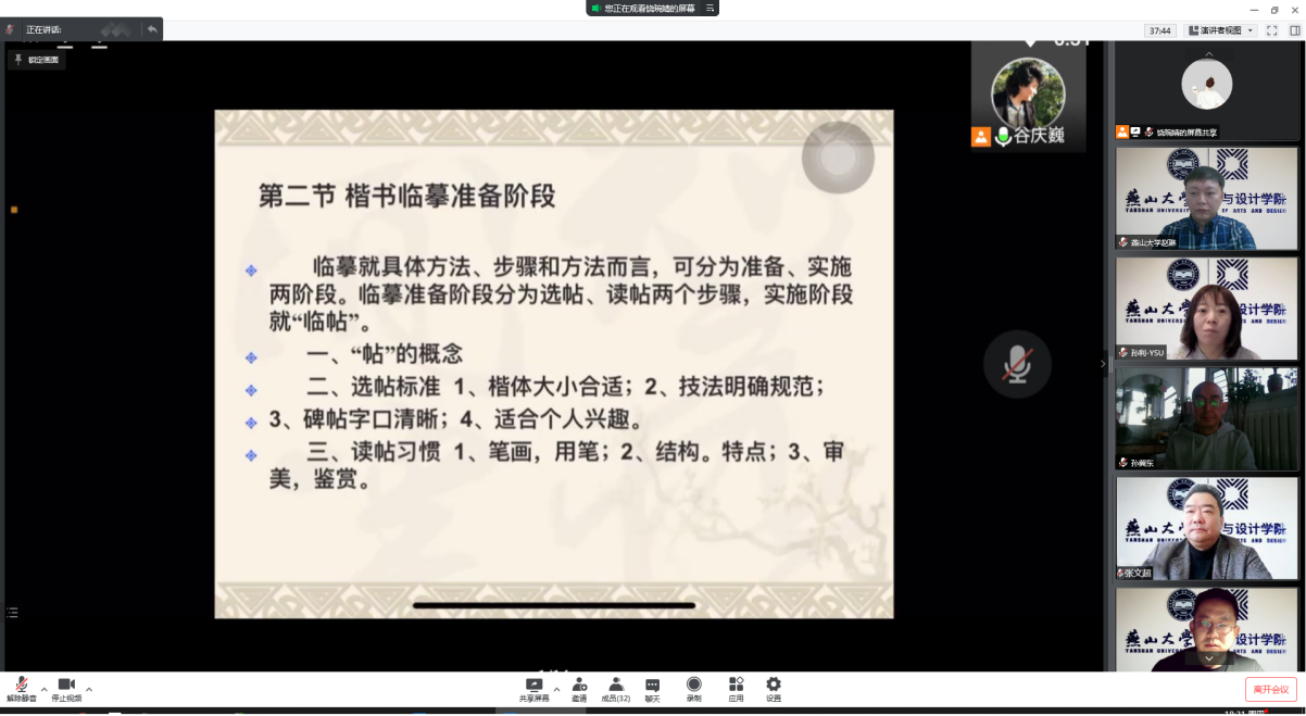 领导班子、本科教学指导委员会、教务、督导共同线上督导教研及观摩系列活动,本次活动旨在促进面向全校开设艺术类通识美育课程并承担各级教改任务的“新六艺”美育教育教研团队建设。