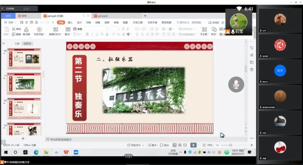六位教师依托形式多样的线上教学方式授课,包括学习通+腾讯会议+qq群、慕课平台+钉钉+微信群等多种形式通过语音、视频等形式进行师生互动,实现学生线上学习、线上交流,及时反馈等教学环节,并充分利用在线课程优质资源,引导学生在线学习,组织学生讨论、答疑,为学生的美育教育学习提供了多重保障。